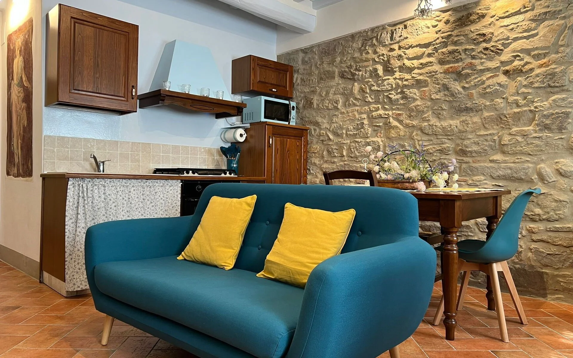 Designed as an intimate retreat for two, Casa Adelina features a cozy living room with a well-equipped kitchenette, a comfortable double bedroom, and a modern bathroom. The apartment’s recent restoration highlights the best of both worlds: original architectural details—such as exposed wooden beams and classic terracotta floors—paired beautifully with fresh, contemporary touches.