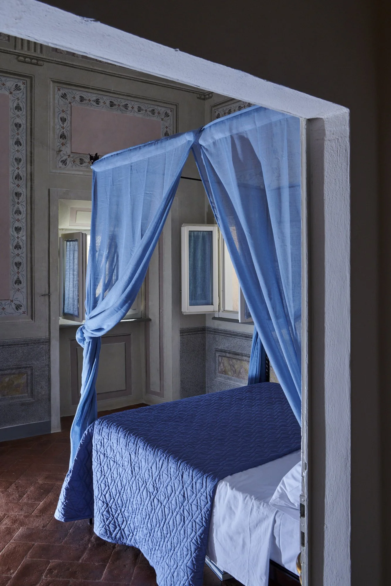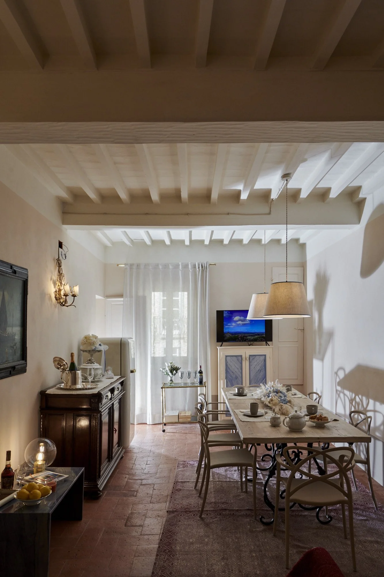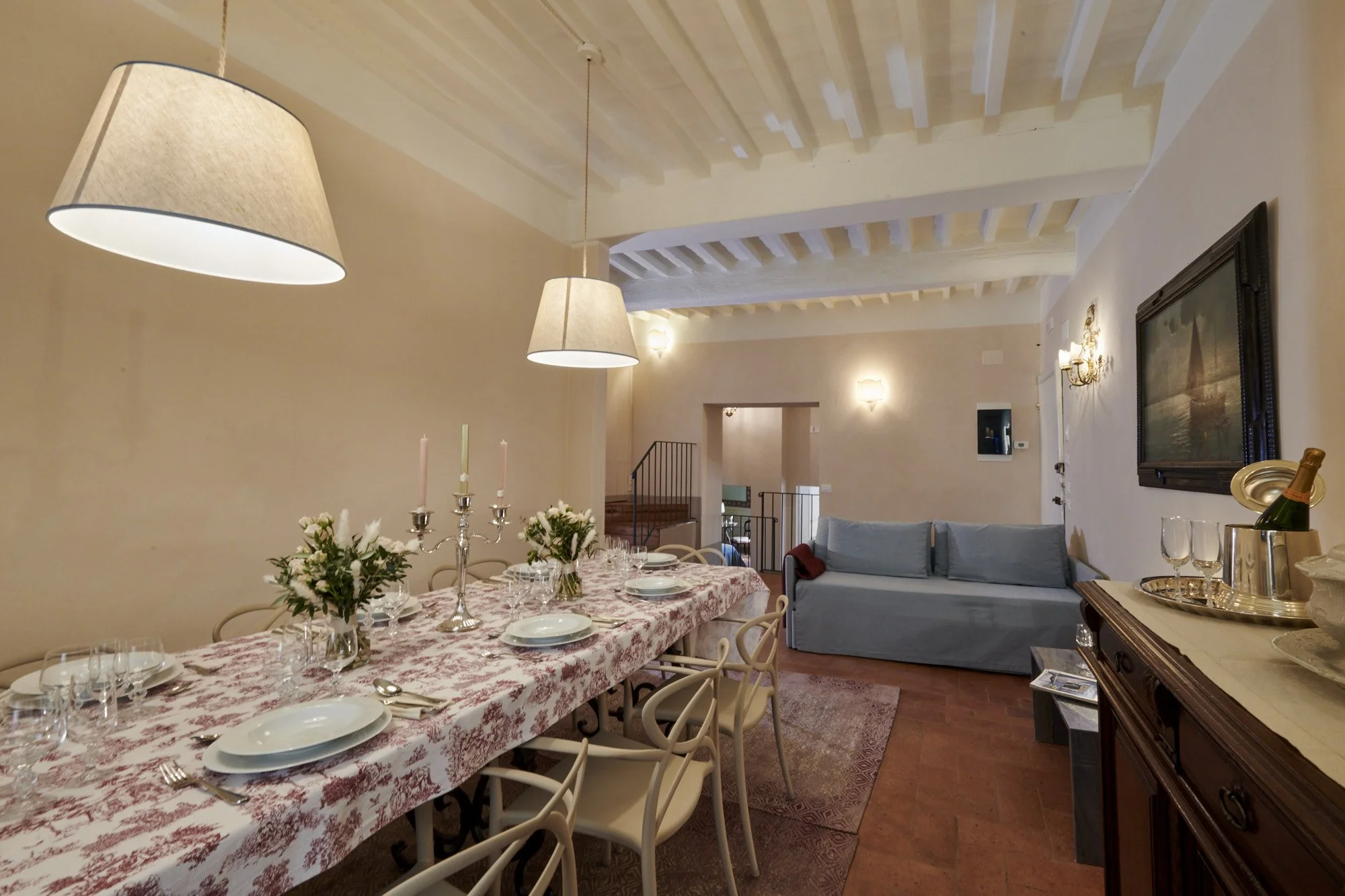 A historic home in the heart of Cortona, Casa Adriana is located on the top floor of a centuries-old palazzo, a height from which one can revel in spectacular views over the town center and the stunning up-close perspective of the commune (town hall clock tower). The rare Tuscan furnishings and one-of-a-kind fresco paintings adorning the walls make this home a gem of Cortonese architecture and interior design.