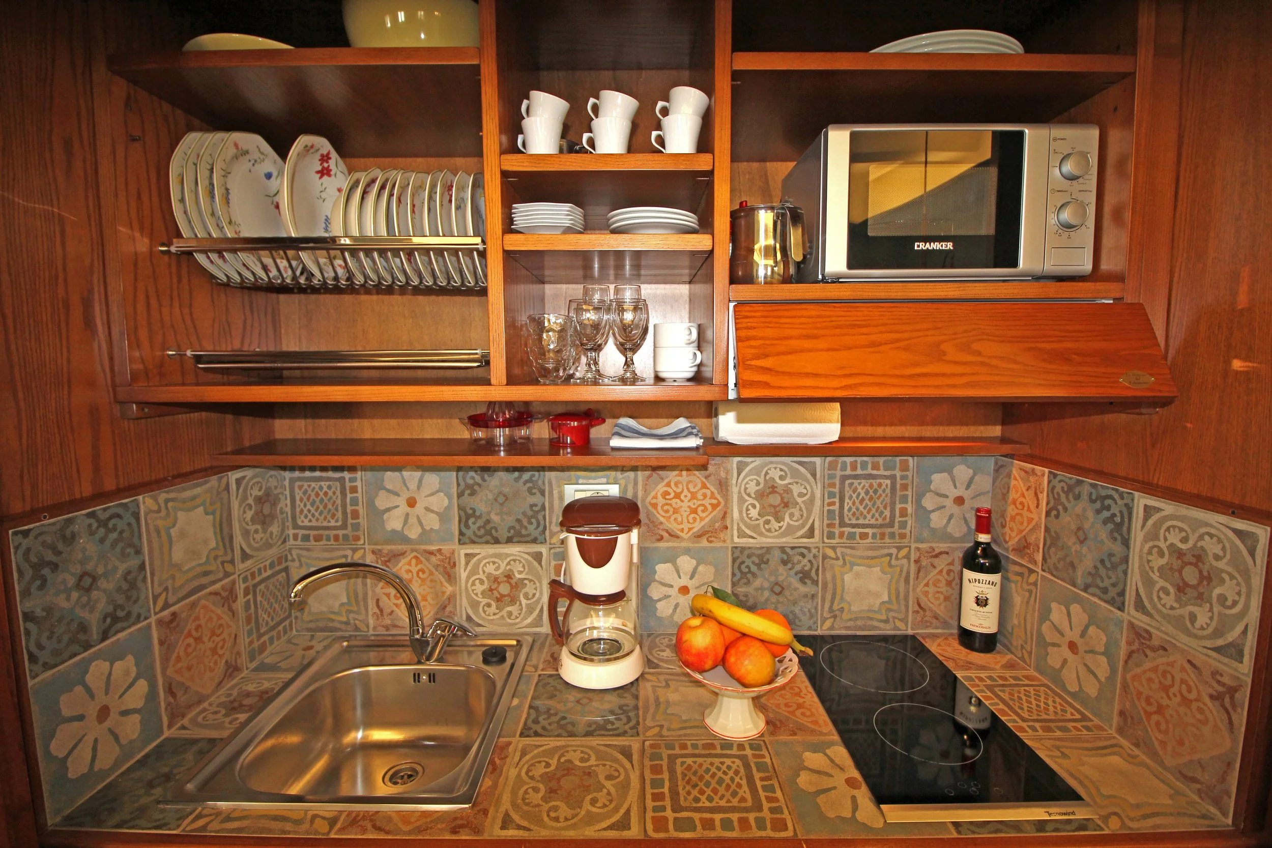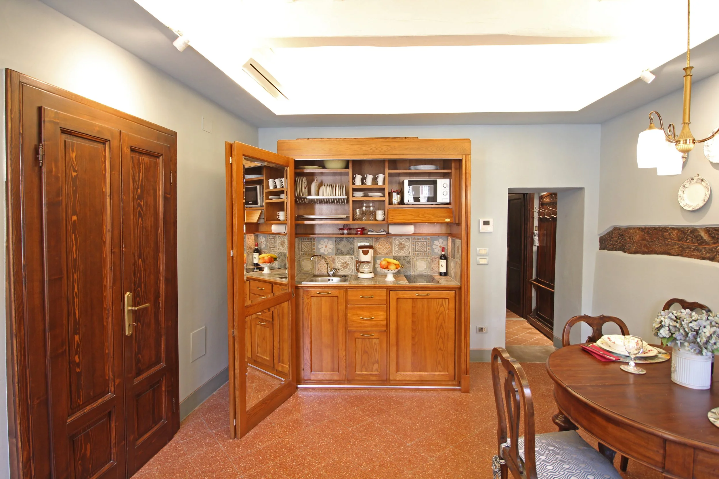 Casa Piazza features a stylish open-plan living space that combines the kitchen and lounge area. The interior blends modern design with antique elements, creating a space that feels both elegant and welcoming. Within the living area, a built-in cabinet cleverly hides a fully equipped kitchen complete with a stovetop, refrigerator, microwave, Moka coffee maker, drip coffee machine, toaster, and all the essentials needed to prepare local dishes.