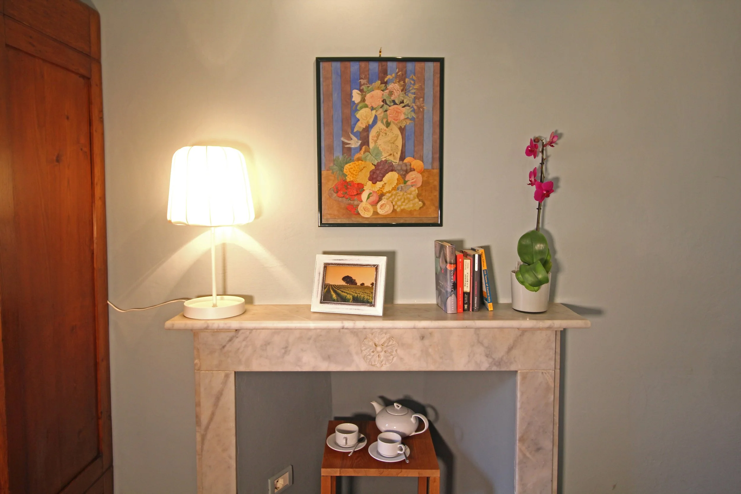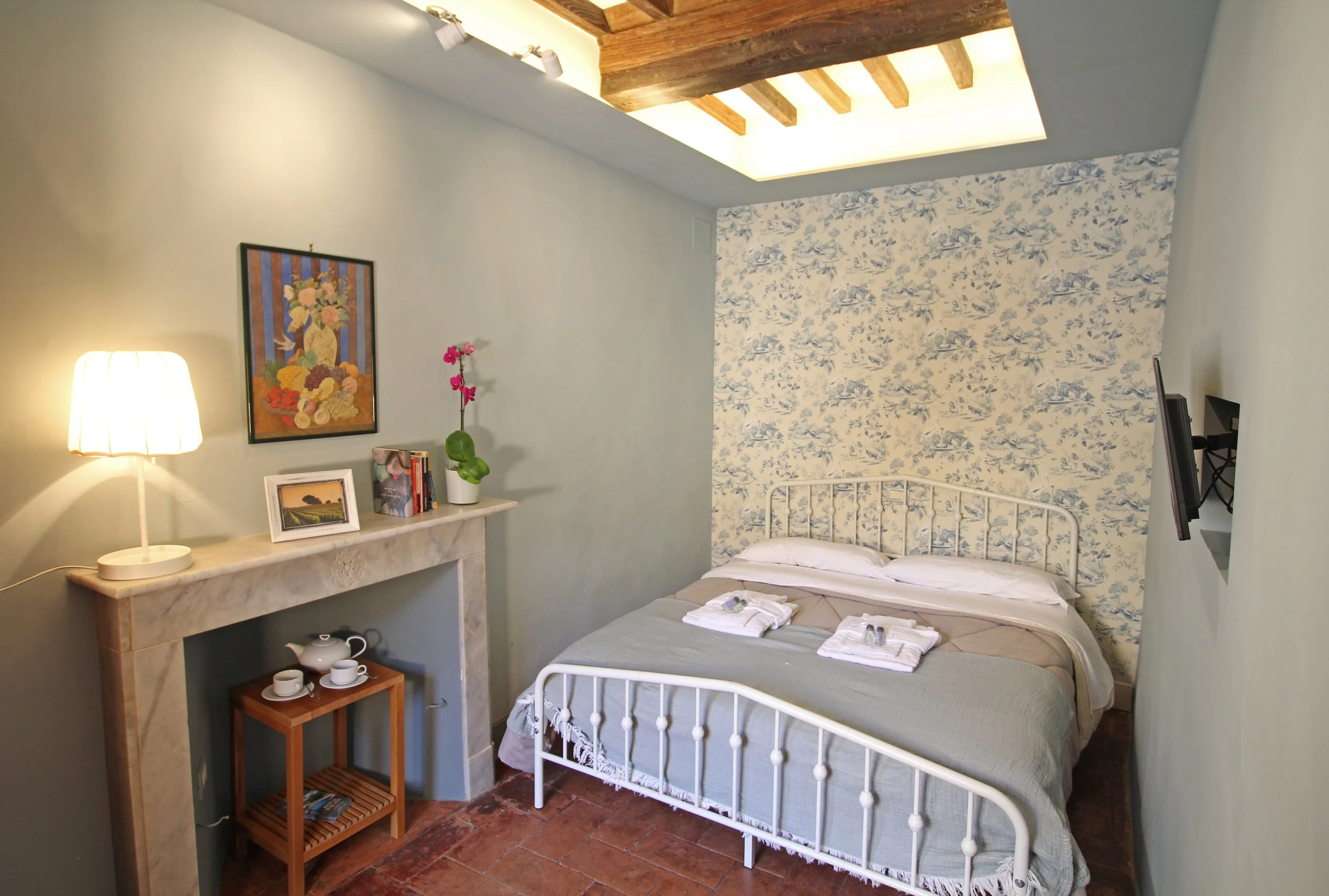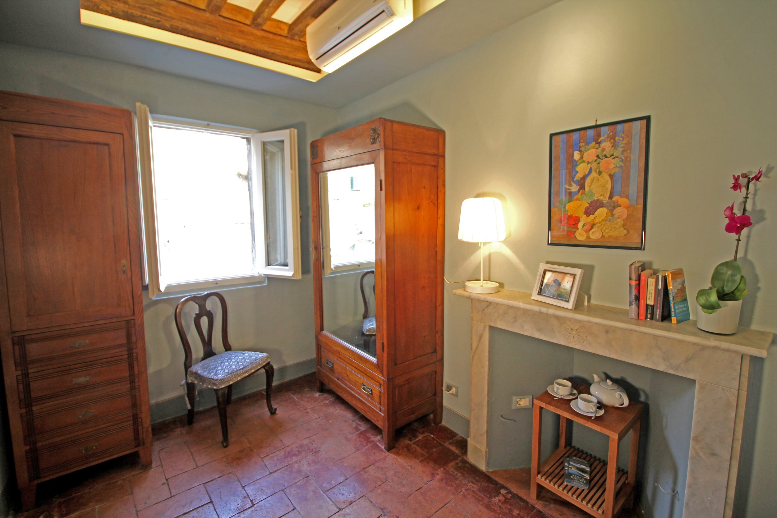 Further inside the apartment is a bright and beautifully furnished double bedroom, a peaceful and cozy space designed for rest and relaxation. The room includes a double bed, a wardrobe, and a decorative (non-functioning) fireplace. Its windows face the main square, providing a charming view of the lively activities that take place in the heart of the town. In the morning, you can open the windows to let in the sunlight and enjoy the sounds of this historic Etruscan town coming to life.