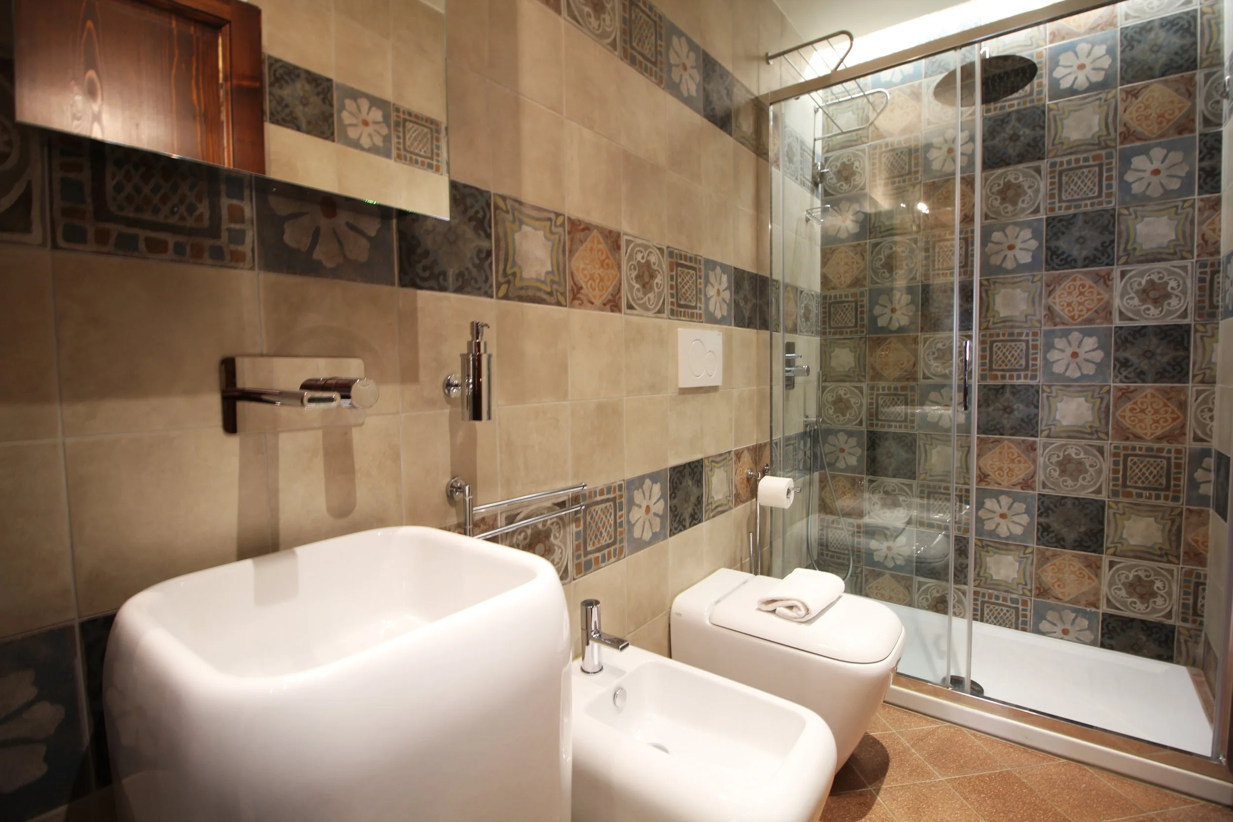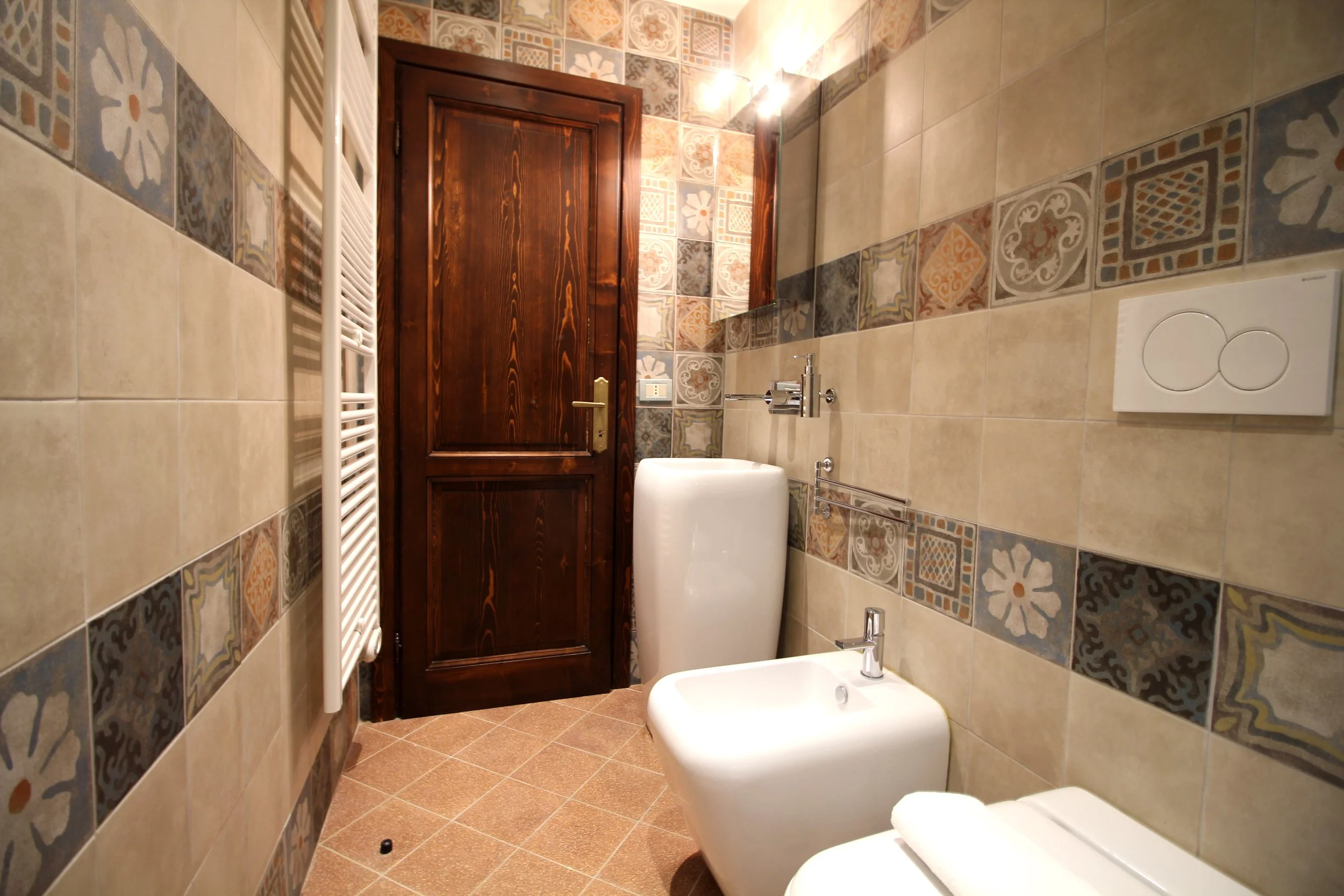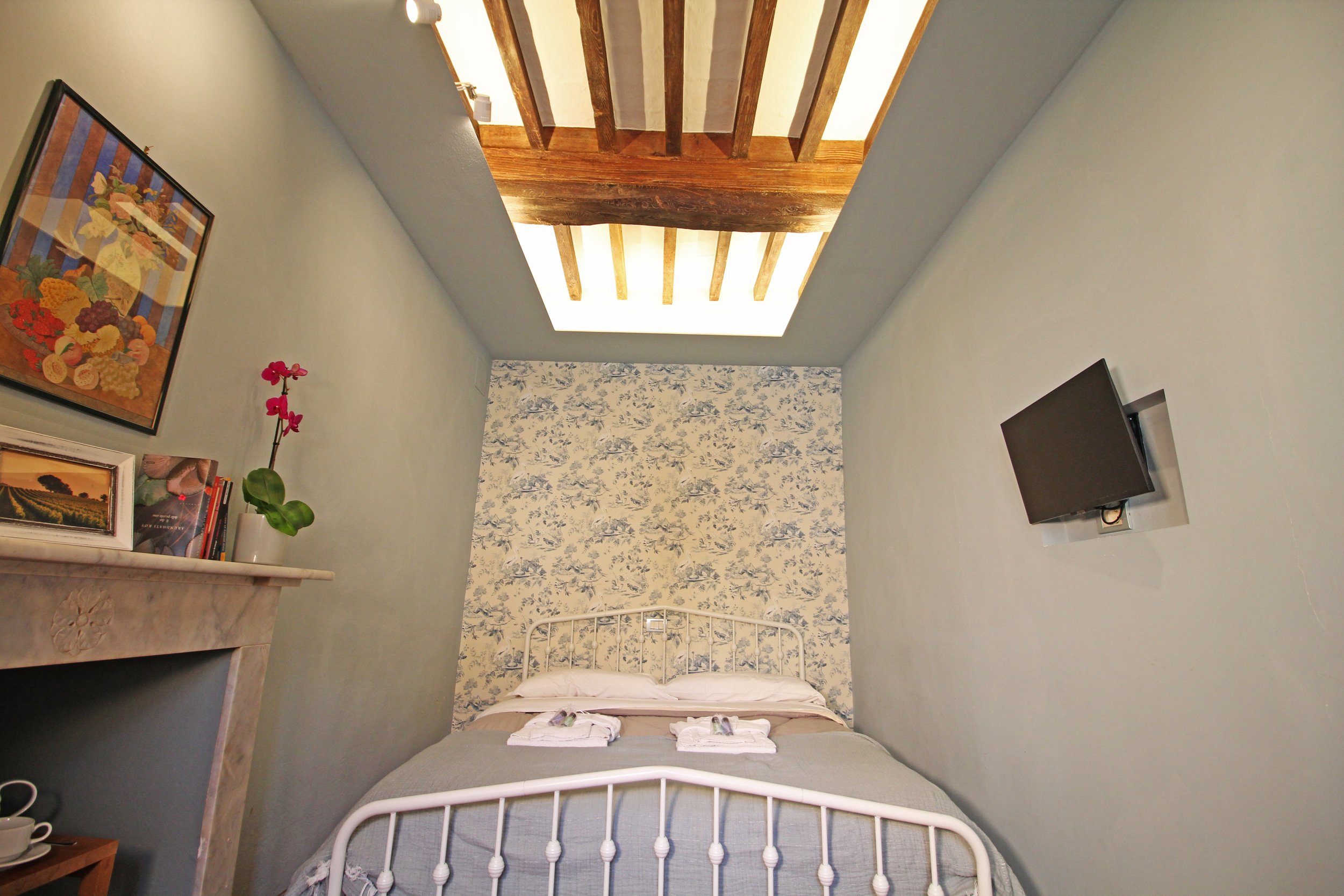 Further inside the apartment is a bright and beautifully furnished double bedroom, a peaceful and cozy space designed for rest and relaxation. The room includes a double bed, a wardrobe, and a decorative (non-functioning) fireplace. Its windows face the main square, providing a charming view of the lively activities that take place in the heart of the town. In the morning, you can open the windows to let in the sunlight and enjoy the sounds of this historic Etruscan town coming to life.