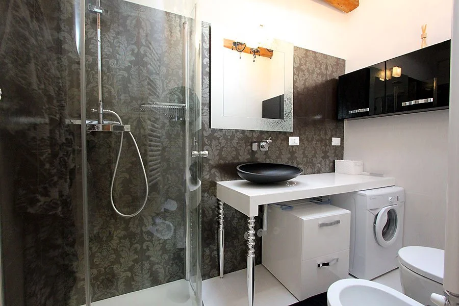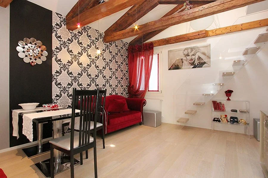 Casa Sant’Angelo is an exquisitely detailed two-bedroom, two-full-bathroom apartment spanning two levels on the second floor. Upon entering, you encounter a charming open-plan kitchen seamlessly integrated with opulent Baroque furnishings alongside contemporary pieces. The vaulted ceiling, crafted from centuries-old wooden beams, imparts a sense of spaciousness and luminosity while preserving the integrity of the ancient architecture. The two inviting bedrooms and modern bathrooms extend from the main living area, boasting high-beamed ceilings. The bathrooms, complete with showers, exude sleek, contemporary design. Ascend a staircase to discover a lofted mezzanine adorned in a sumptuous Moroccan theme, overlooking the open-plan space, creating a striking ambiance of light, color, and comfort.