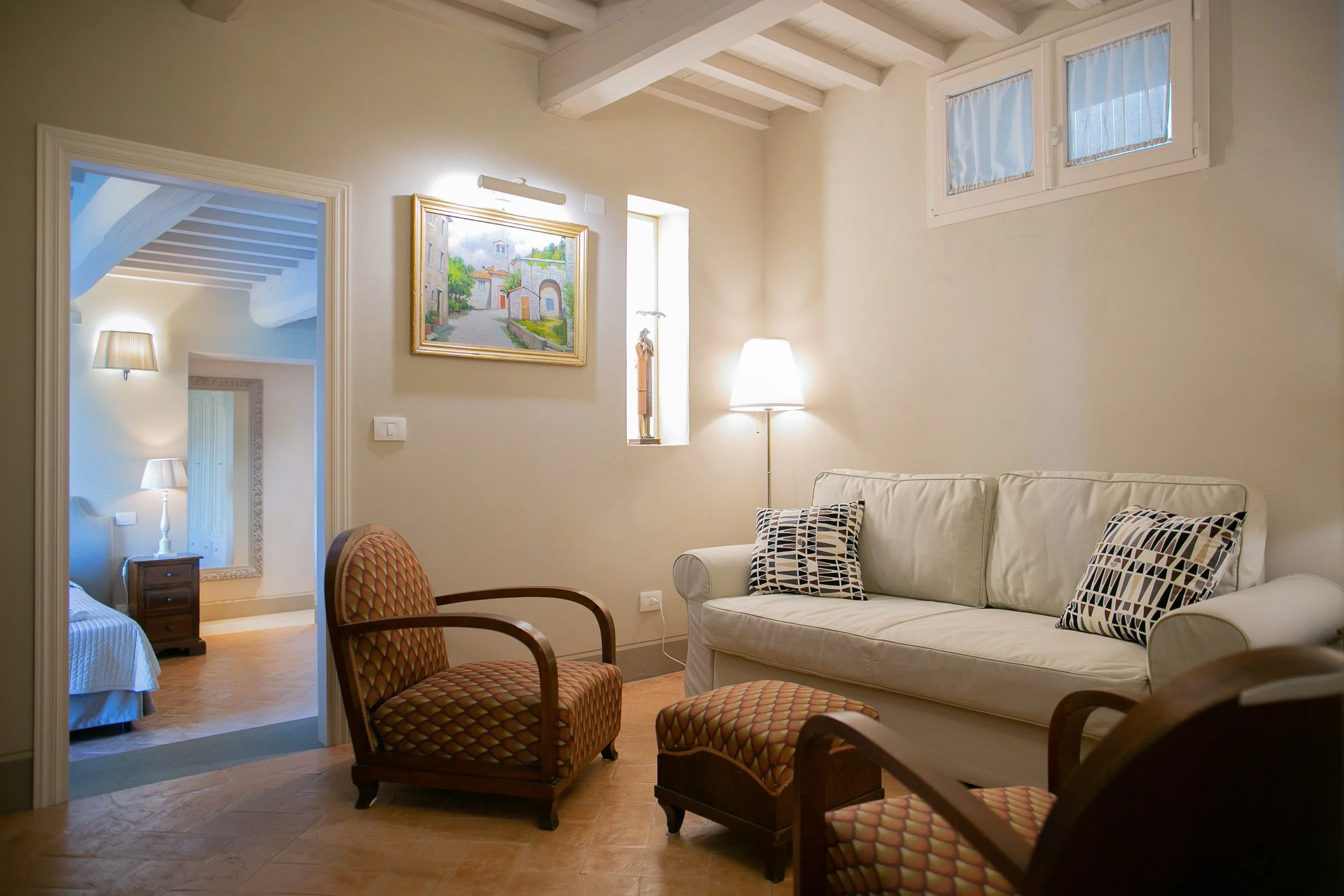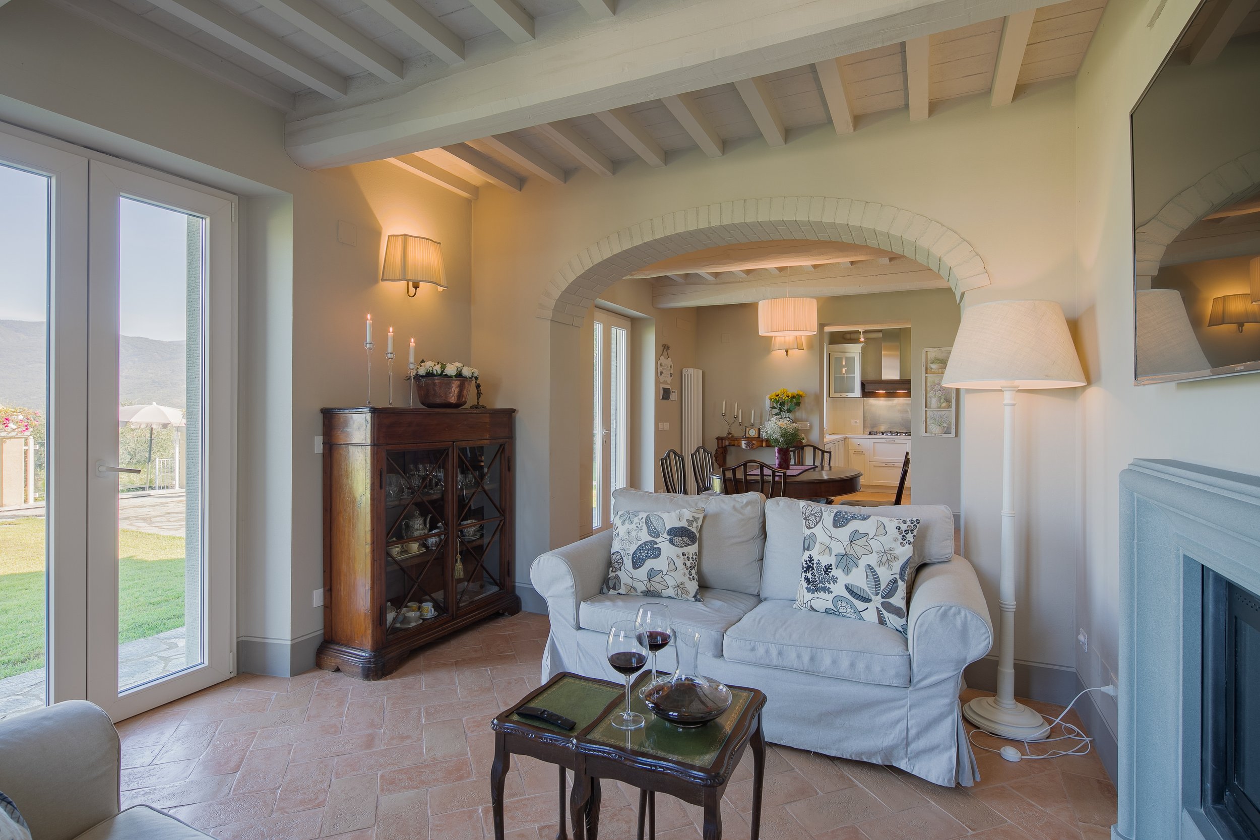 Recently renovated, Villa Carlotta’s interiors combine traditional Tuscan character with refined modern comfort. Thick stone walls, wood-beamed ceilings beneath terra cotta tiles, and graceful arched glass doors connect each room to the garden and views outside, grounding the home firmly in its timeless landscape. Warm, inviting, and beautifully appointed, Villa Carlotta offers an unforgettable setting for creating treasured Tuscan memories.