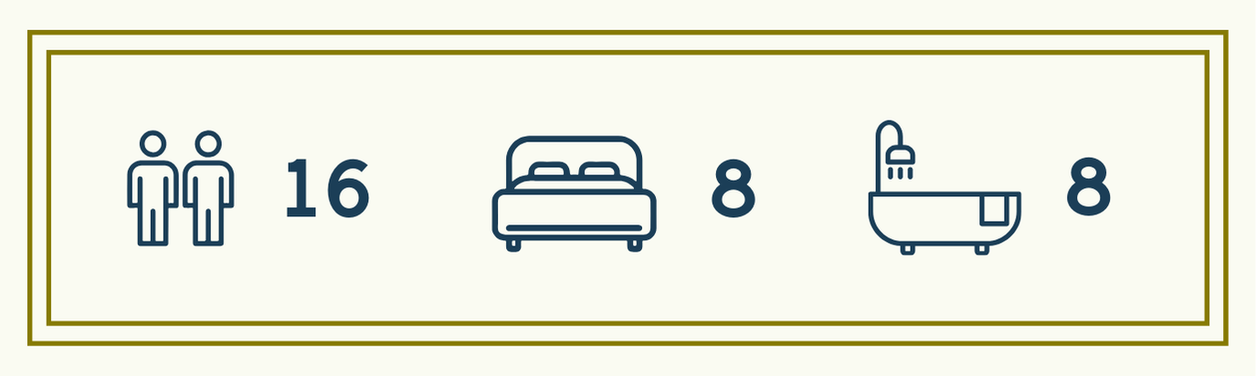 The villa’s exterior features a lush garden with a swimming pool, a barbecue, and an outdoor dining area, as well as a traditional stone staircase connecting the two levels. Inside, classic Tuscan architecture shines through terracotta floors, wooden beams, and timeless furnishings. With 8 bedrooms and 8 bathrooms, the property accommodates up to 16 guests and is thoughtfully arranged into multiple sections—originally two apartments—making it ideal for large groups or several families seeking both shared and private spaces.