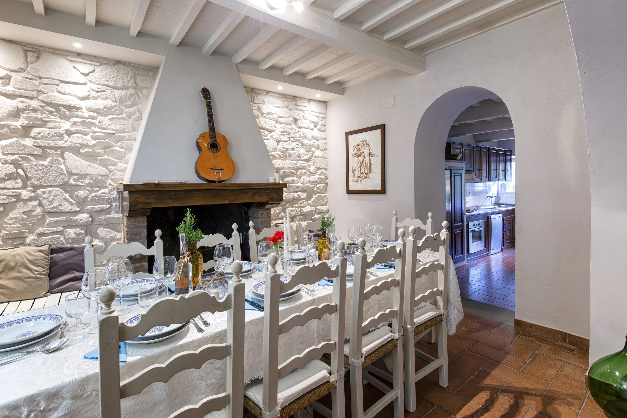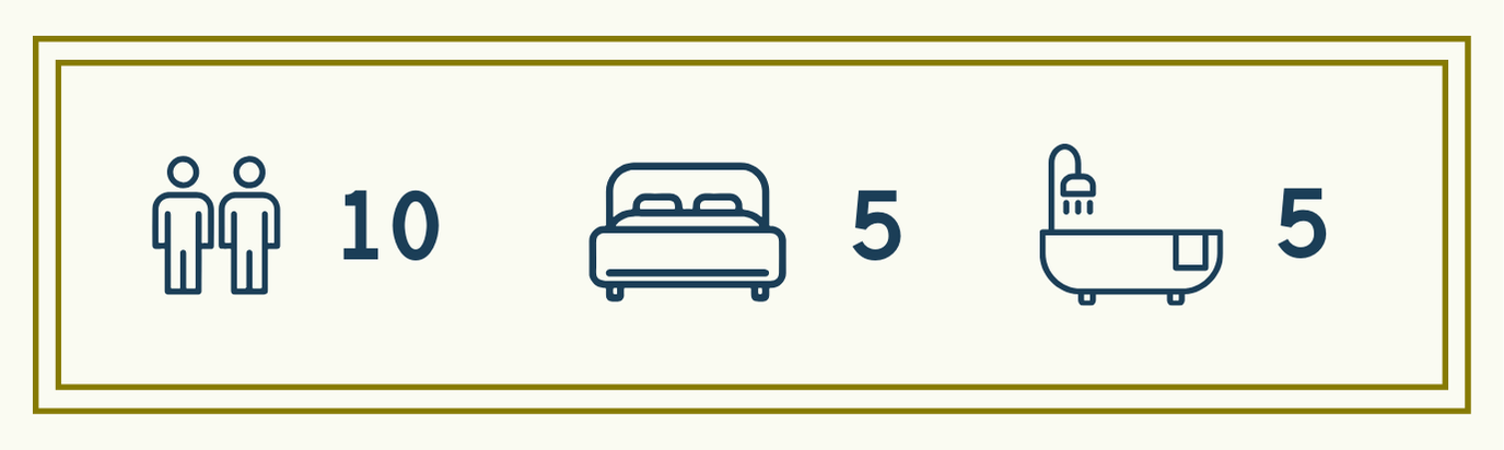 Inside, the two-story villa features hand-selected art, elegant furnishings, and modern amenities throughout. The ground floor includes spacious kitchen, dining, and living areas with large windows overlooking the gardens and surrounding hills. The second level, accessible via both interior and exterior staircases, hosts the villa’s five bedrooms and five full bathrooms, offering comfort and privacy for every guest.