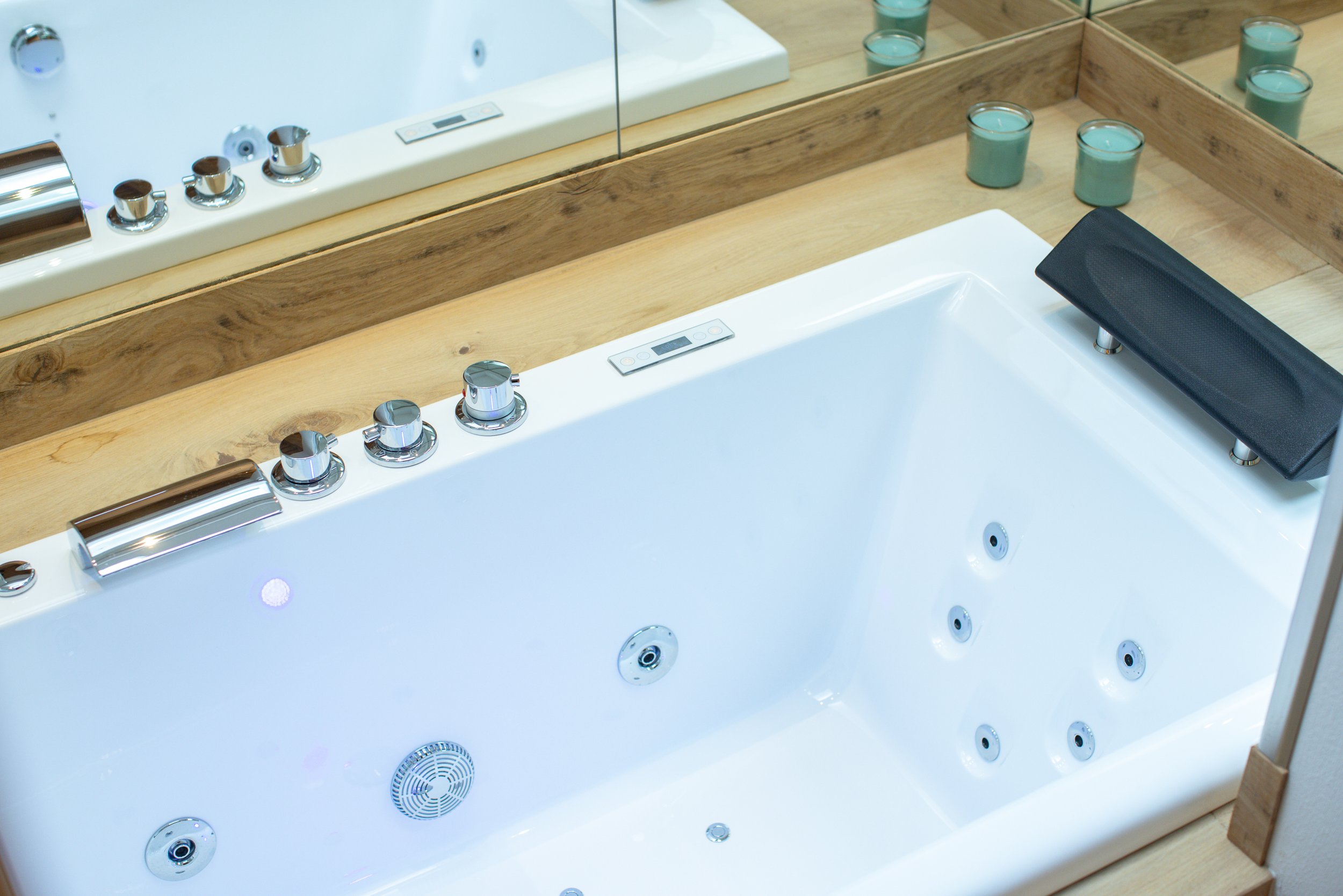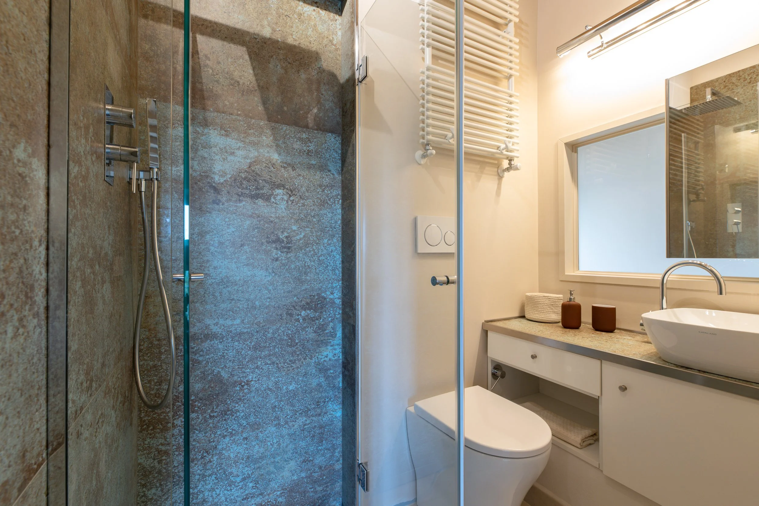 The ground floor welcomes guests into a bright open-plan living area with a corner sofa, a fully equipped kitchen, and a wooden dining table. This level also includes a laundry room and a unique double bedroom featuring a cozy corner bed, a hydromassage tub with chromotherapy and music, and an en-suite bathroom with a luxurious shower, along with an additional bathroom.