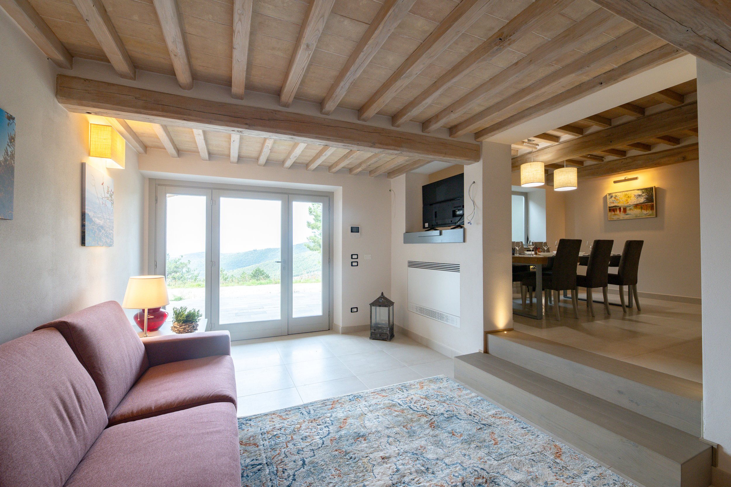 Upstairs, the first floor hosts two double bedrooms—one with an en-suite bathroom and terrace access, and the other with an adjacent bathroom featuring a hydromassage shower. A small living area with a sofa bed and kitchenette opens onto a veranda with a dining table and barbecue, ideal for relaxed meals. With its sweeping views, comfortable layout, and beautiful outdoor areas, Villa Luisa is an inviting home base for a memorable Tuscan holiday.