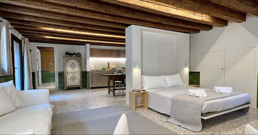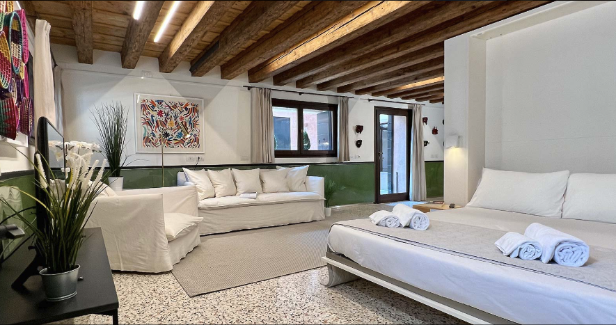 APARTMENT VERDI TERRACE Beautiful apartment with canal view located in the historic center of Venice in the Cannaregio district. The apartment consists of a spacious living area with high-end furnishings and includes a complete kitchen, double bed, living room with double sofa bed, a spacious bathroom (with washing machine) and a private table in the shared courtyard.