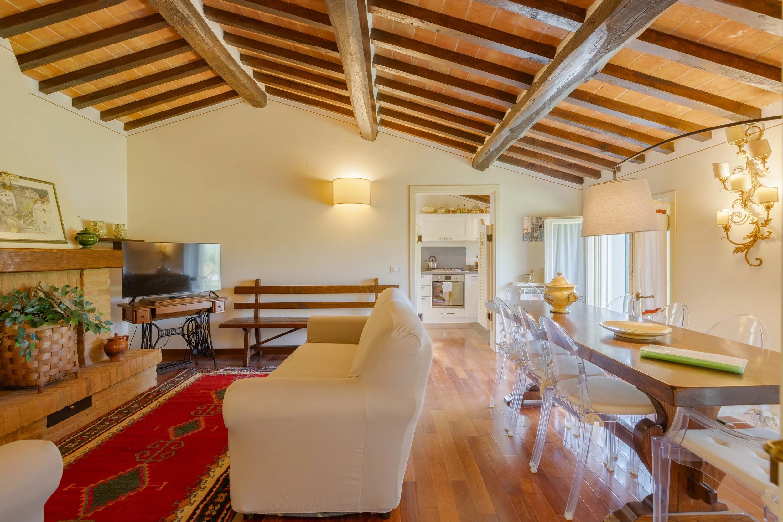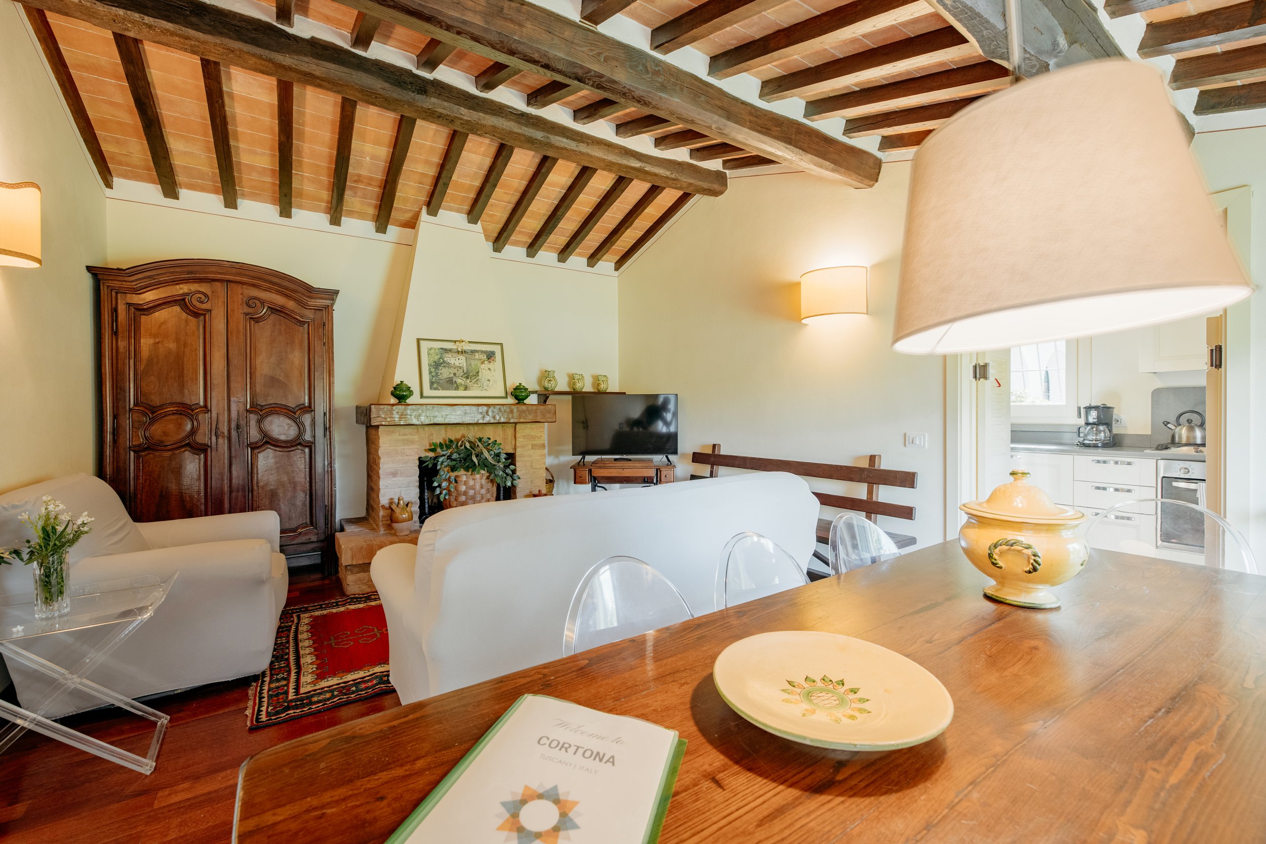 The grounds feature iconic views of the Val Di Chiana, a private swimming pool, and a terrace for dining al fresco.