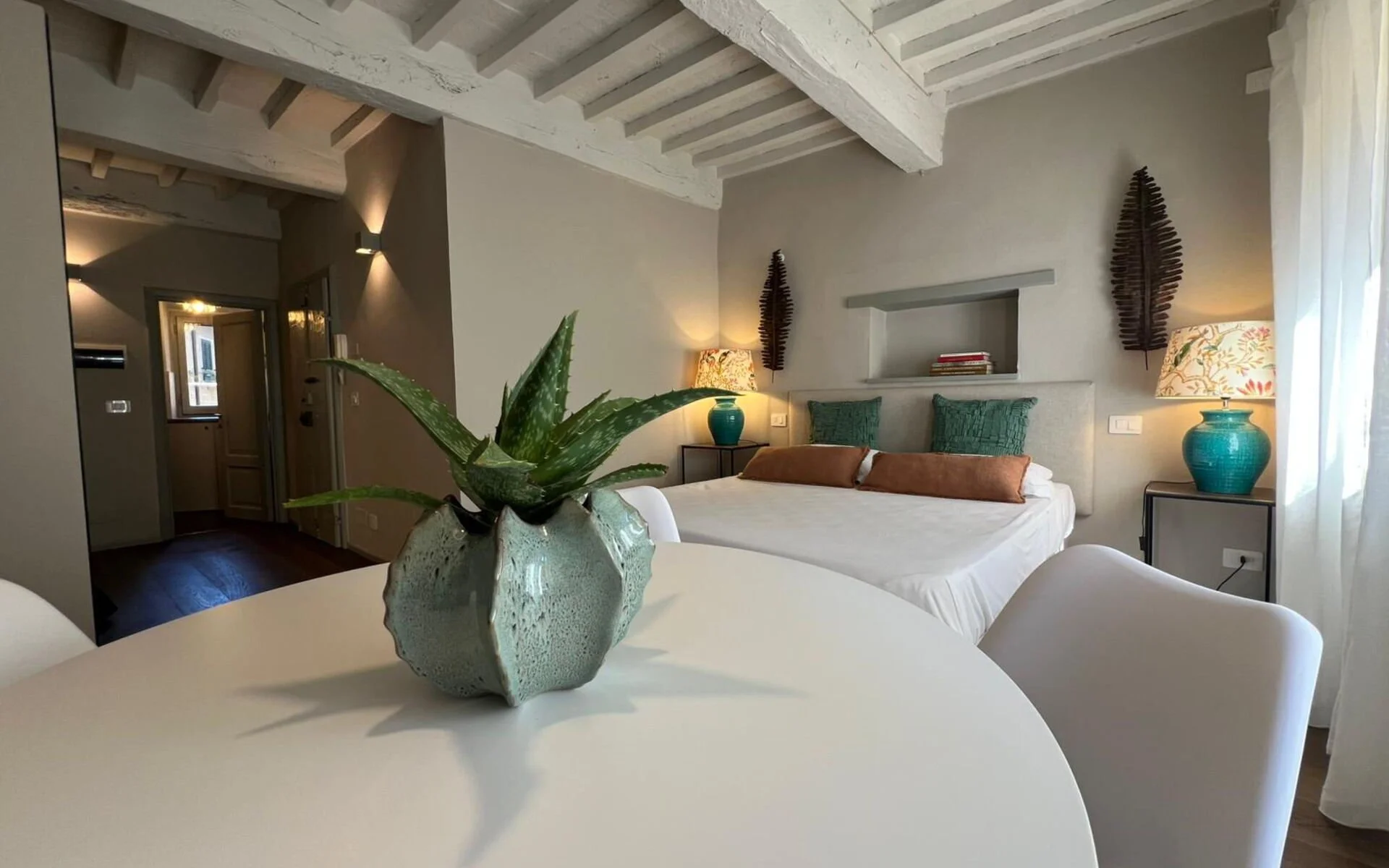 Inside, Suite Guelfa features a bright, open-plan living space with a fully equipped contemporary kitchen and dining area, thoughtfully designed for both relaxation and convenience. The streamlined, modern aesthetic is complemented by warm touches that create a welcoming atmosphere. The sleeping area offers a plush double bed and Smart TV, while the sleek bathroom includes a walk-in shower. Whether returning from a day of sightseeing or enjoying a quiet evening in, Suite Guelfa provides a comfortable and stylish home in the heart of Cortona.